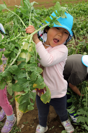 ☆大根掘り 2019.5.9☆ 近くの畑で大根掘りをさせてもらいました! 大きな大根を目の前に、みんな頑張って抜いていましたよ! 可愛いカブも取らせてもらいました。 |